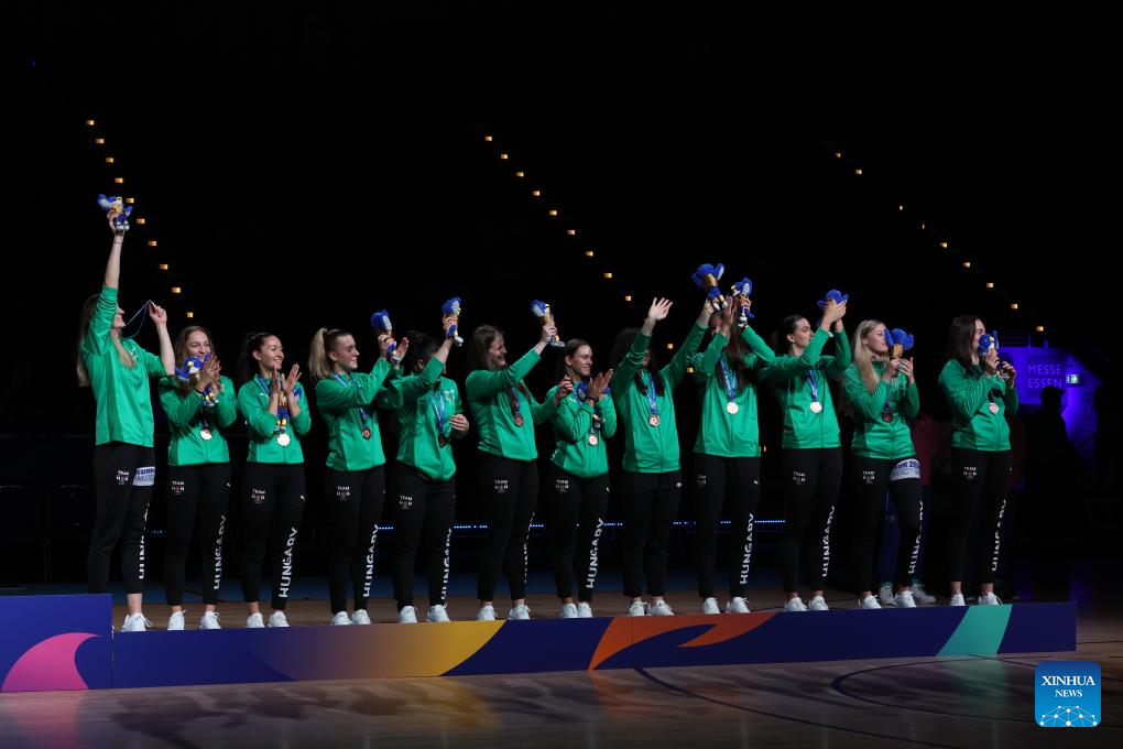 Third-placed, players of Hungary, celebrate during the awarding ceremony for the women's basketball at the Rhine-Ruhr 2025 FISU World University Games in Essen, Germany, July 25, 2025. (Xinhua/Zhang Fan)
