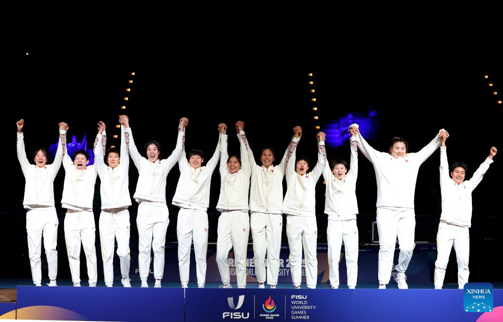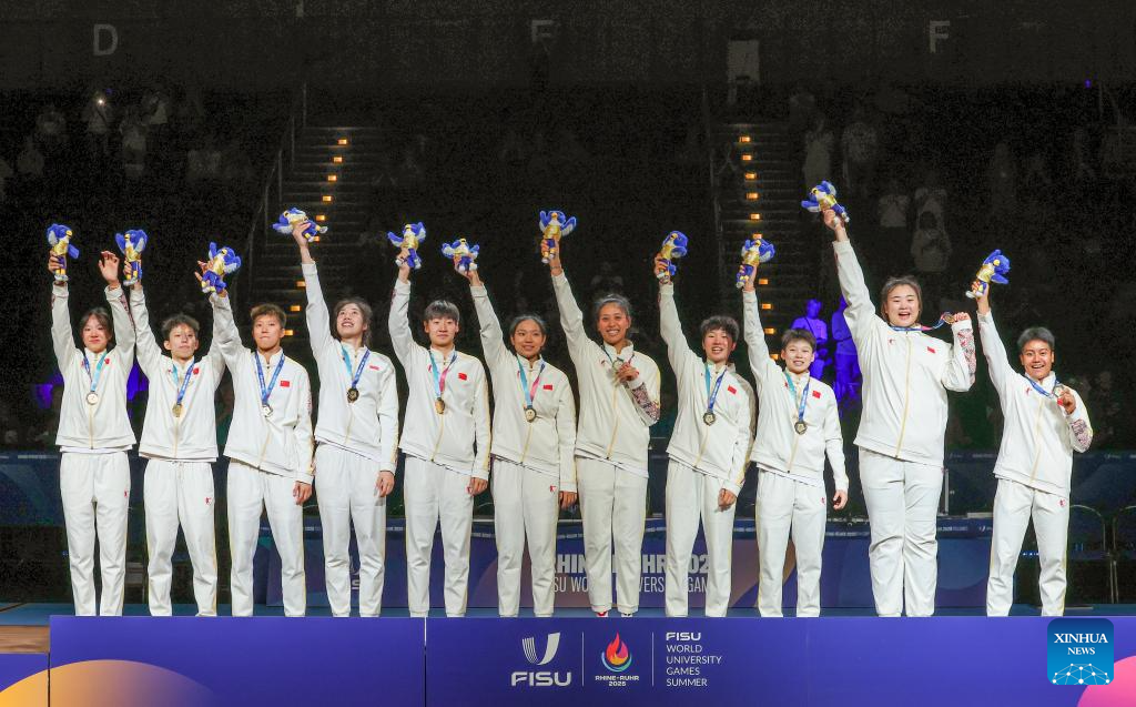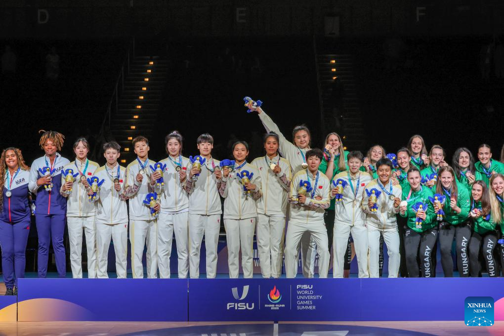Players of China celebrate during the awarding ceremony of the women's basketball final between China and the United States at the Rhine-Ruhr 2025 FISU World University Games in Essen, Germany, July 25, 2025. (Xinhua/Zhang Fan)