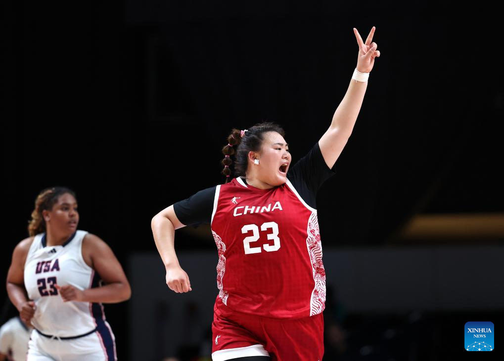 Liu Yutong (R) of China gestures during the women's basketball final between China and the United States at the Rhine-Ruhr 2025 FISU World University Games in Essen, Germany, July 25, 2025. (Xinhua/Zhang Chen)