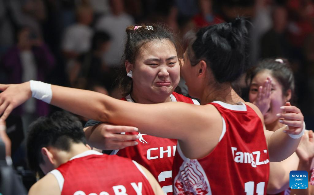 Players of China celebrate after the women's basketball final between China and the United States at the Rhine-Ruhr 2025 FISU World University Games in Essen, Germany, July 25, 2025. (Xinhua/Zhang Fan)
