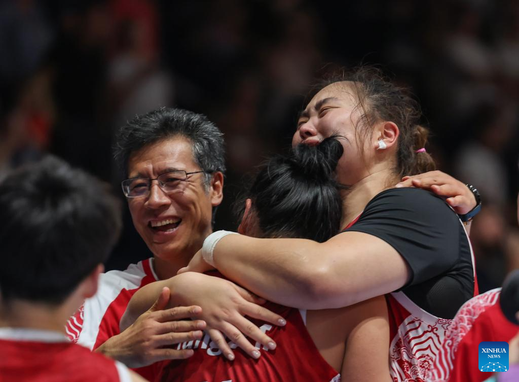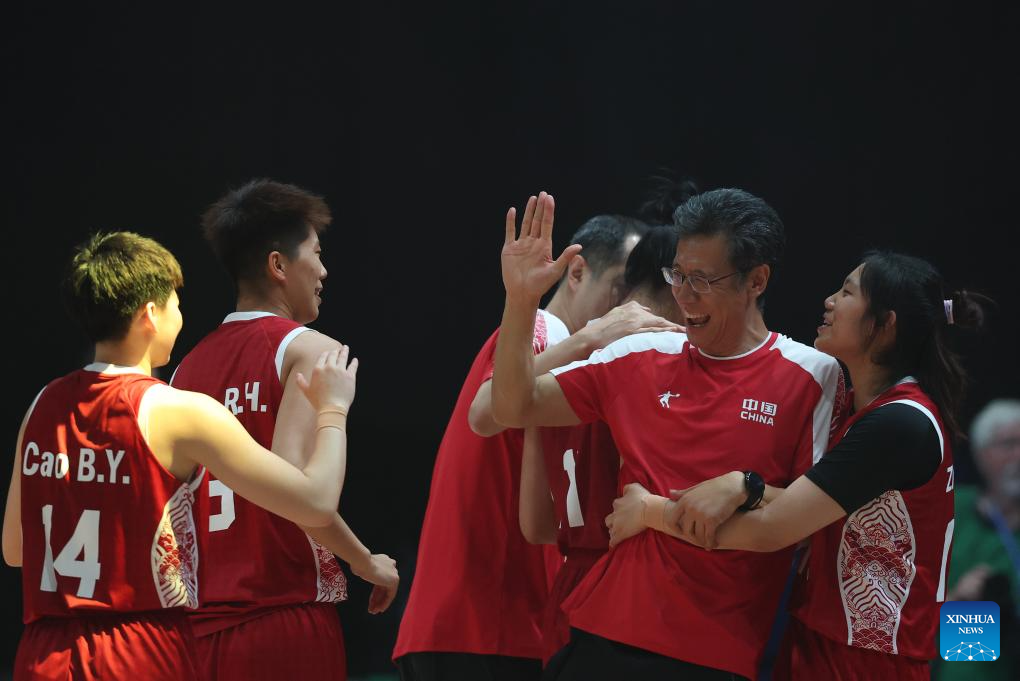 Li Sunnan (2nd R), coach of team China celebrates with players after the women's basketball final between China and the United States at the Rhine-Ruhr 2025 FISU World University Games in Essen, Germany, July 25, 2025. (Xinhua/Zhang Chen)