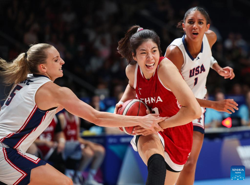 Cao Boyi (L) of China breaks through during the women's basketball final between China and the United States at the Rhine-Ruhr 2025 FISU World University Games in Essen, Germany, July 25, 2025. (Xinhua/Zhang Fan)