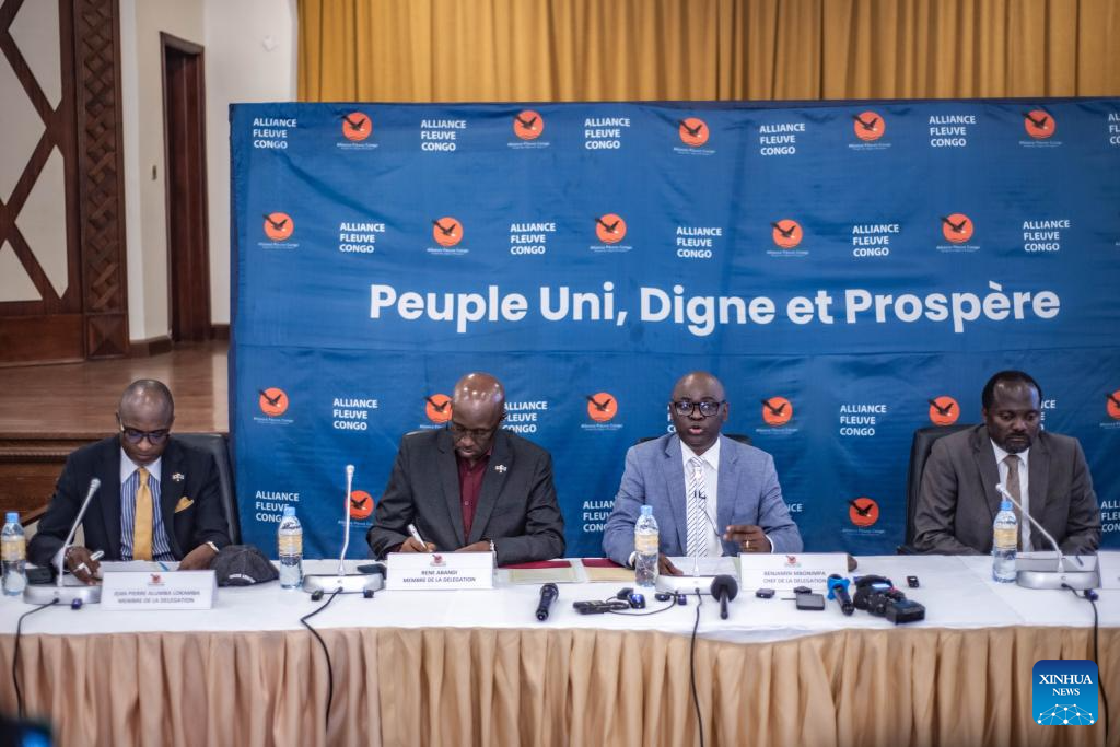Benjamin Mbonimpa (2nd R), M23's representative in several rounds of talks with Kinshasa in Doha, attends a press conference in Goma, the Democratic Republic of the Congo (DRC), July 25, 2025. The March 23 Movement (M23) rebel group announced on Friday that the release of over 700 people detained in connection with the conflict is a prerequisite for any further dialogue with the Democratic Republic of the Congo (DRC) government.