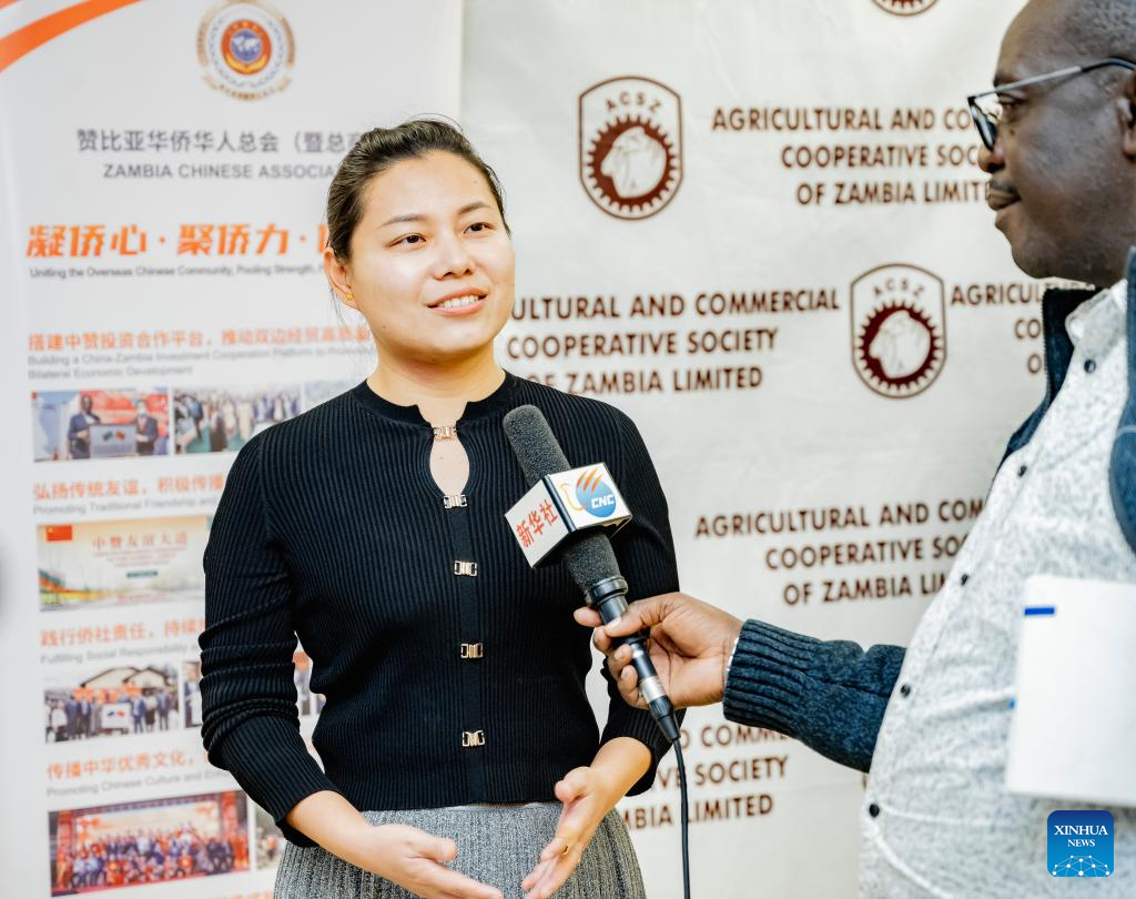 Zambia Chinese Association (ZCA) General Secretary Wang Chunyan speaks during an interview with Xinhua in Lusaka, Zambia, July 25, 2025. About 100 Chinese companies are expected to exhibit at the 97th Agricultural and Commercial Show to boost business ties, the ZCA revealed on Friday. (Xinhua/Peng Lijun)
