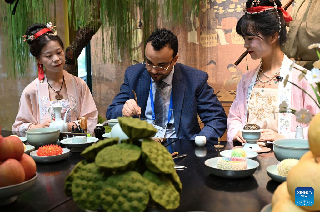 A participant (C) of the Shanghai Cooperation Organization (SCO) Media and Think Tank Summit tries a traditional Chinese tea-making technique at the venue of the summit in Zhengzhou, central China's Henan Province, July 25, 2025. Participants of the summit are treated to a showcase of items listed as intangible cultural heritage, along with folk culture performances with local characteristics, at the venue of the summit, which is held here from July 23 to 27. (Xinhua/Hao Yuan)