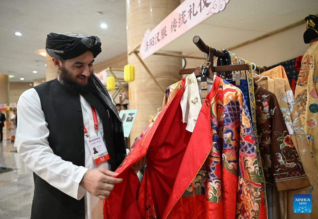 A participant of the Shanghai Cooperation Organization (SCO) Media and Think Tank Summit shops for traditional Chinese attires at the venue of the summit in Zhengzhou, capital of central China's Henan Province, July 25, 2025. Participants of the summit are treated to a showcase of items listed as intangible cultural heritage, along with folk culture performances with local characteristics, at the venue of the summit, which is held here from July 23 to 27. (Xinhua/Li Jianan)