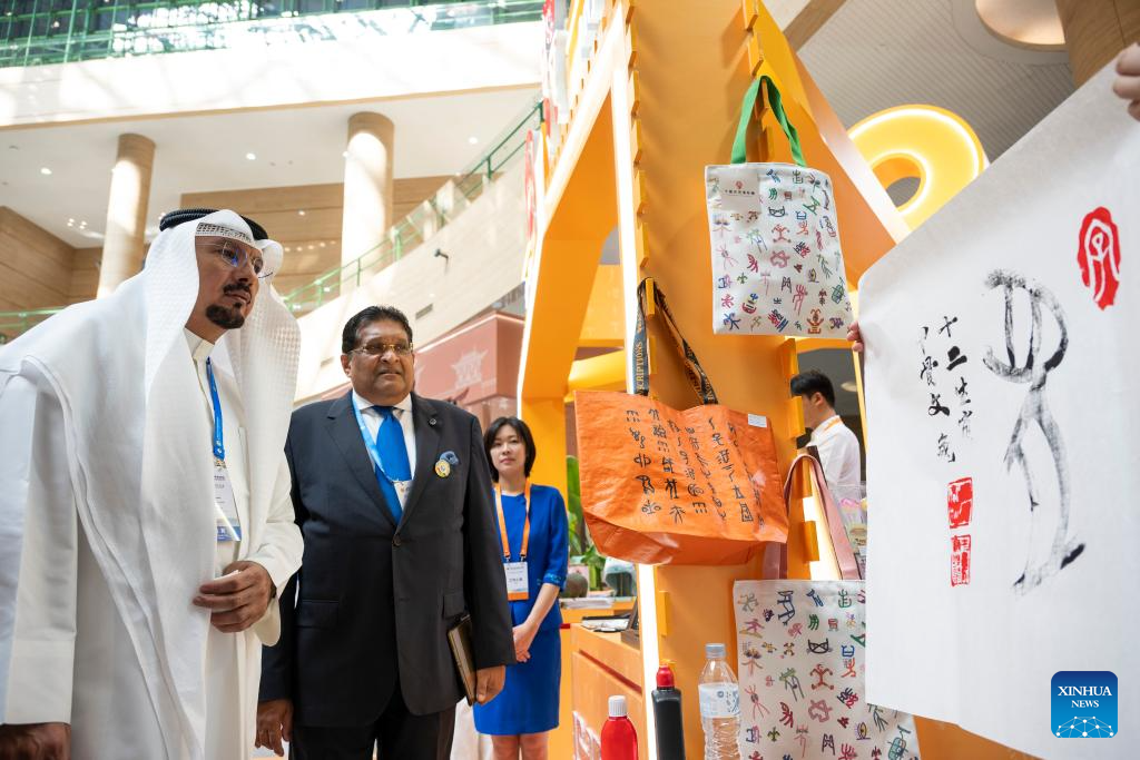 Participants of the Shanghai Cooperation Organization (SCO) Media and Think Tank Summit visit the booth of Anyang City of Henan at the venue of the summit in Zhengzhou, capital of central China's Henan Province, July 24, 2025. Participants of the summit are treated to a showcase of items listed as intangible cultural heritage, along with folk culture performances with local characteristics, at the venue of the summit, which is held here from July 23 to 27. (Xinhua/Fu Tian)