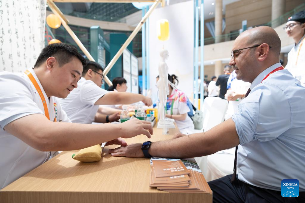 A participant (R) of the Shanghai Cooperation Organization (SCO) Media and Think Tank Summit experiences traditional Chinese medicine therapy at the venue of the summit in Zhengzhou, central China's Henan Province, July 24, 2025. Participants of the summit are treated to a showcase of items listed as intangible cultural heritage, along with folk culture performances with local characteristics, at the venue of the summit, which is held here from July 23 to 27. (Xinhua/Bai Xueqi)