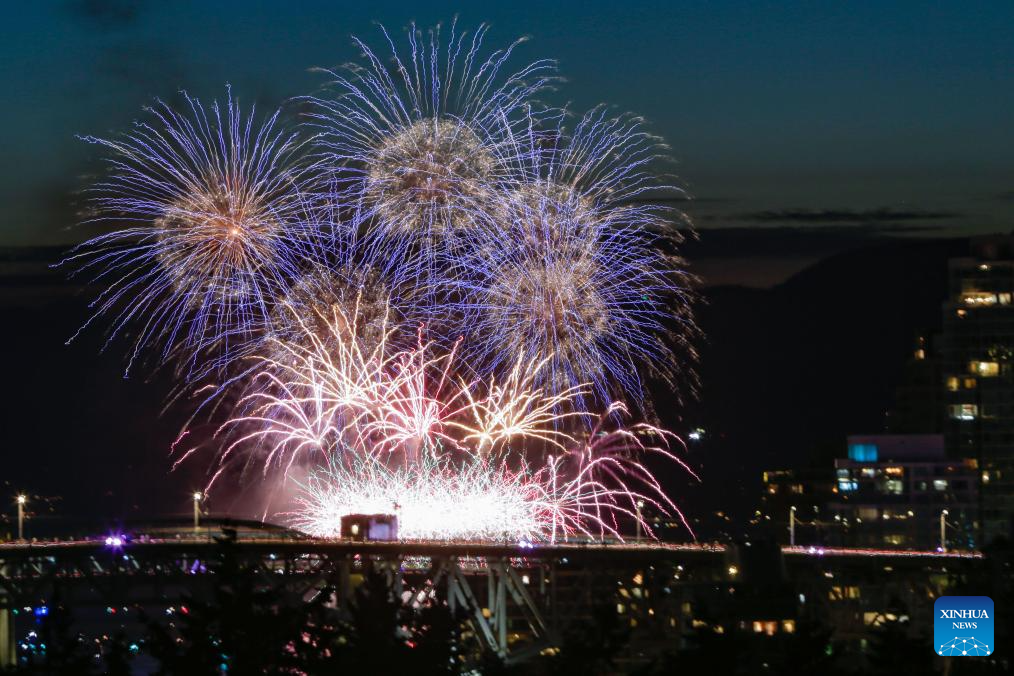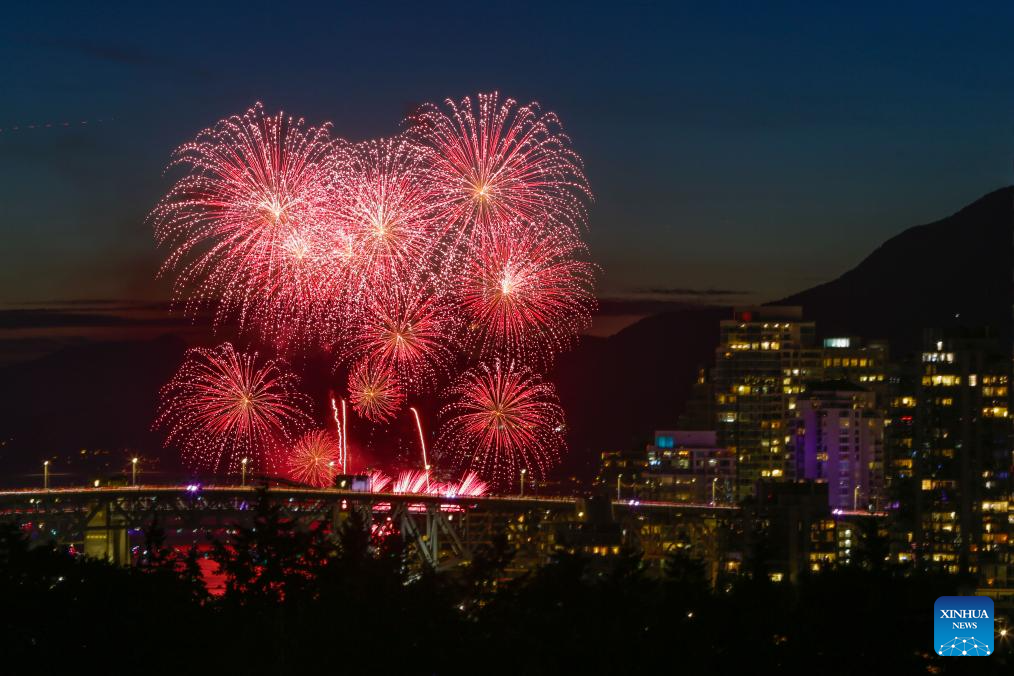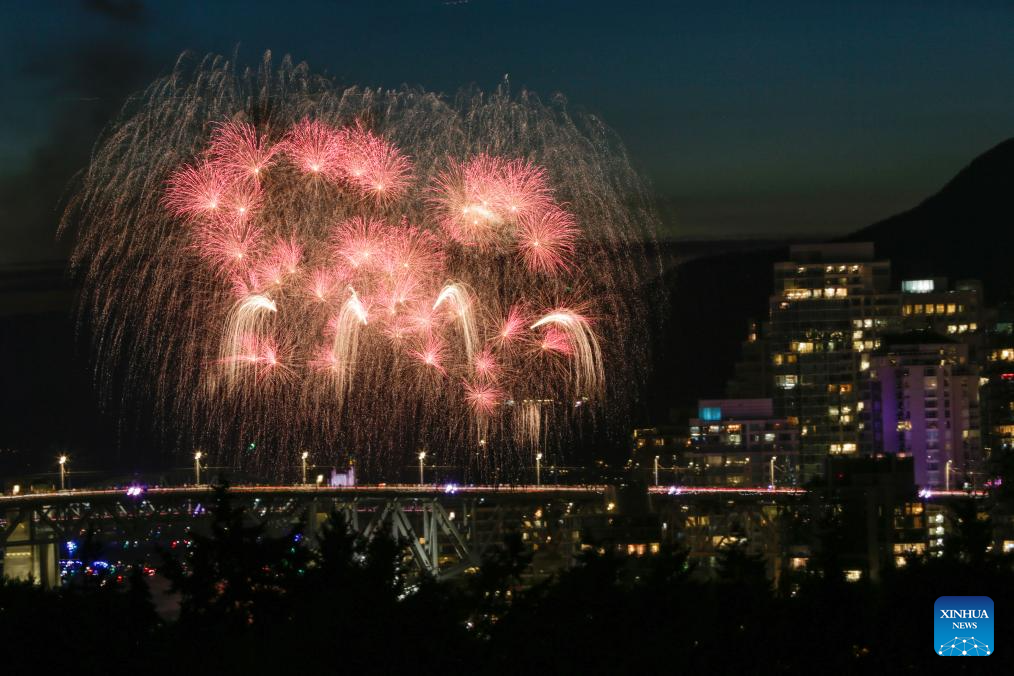 Fireworks light up the sky during the 2025 Celebration of Light at English Bay in Vancouver, British Columbia, Canada, July 26, 2025. A fireworks show presented by Team Nova Scotia illuminated the sky on Saturday, marking the final performance of the 2025 Celebration of Light. (Photo by Liang Sen/Xinhua)