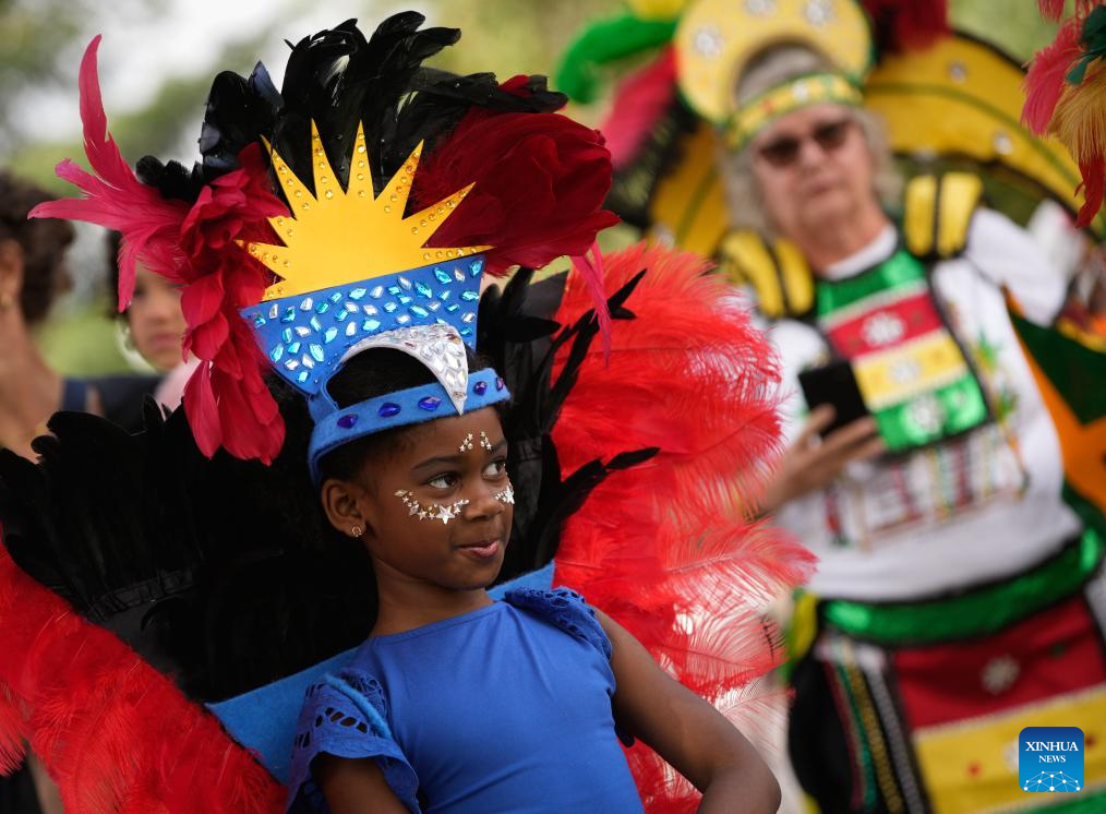 A child in costume poses for photos during the Carnival Parade at the 2025 Caribbean Days Festival in Coquitlam, British Columbia, Canada, July 26, 2025. The two-day event featured live music, cultural performances, a parade, traditional Caribbean cuisine, and a craft market, highlighting the vibrancy of Caribbean culture. (Photo by Liang Sen/Xinhua)