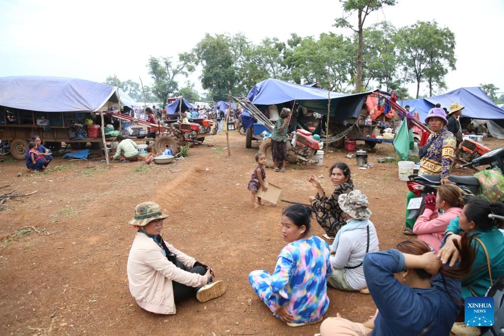 Cambodian evacuees from Cambodia-Thai border conflict gather at a refuge in Oddar Meanchey province, Cambodia, July 26, 2025. About 80,000 Cambodian villagers have fled their homes for safe refuge as armed clashes between Cambodian and Thai soldiers over disputed border areas have entered a fourth day, a defense ministry spokesperson said on Sunday. (Photo by Sao Khuth/Xinhua)