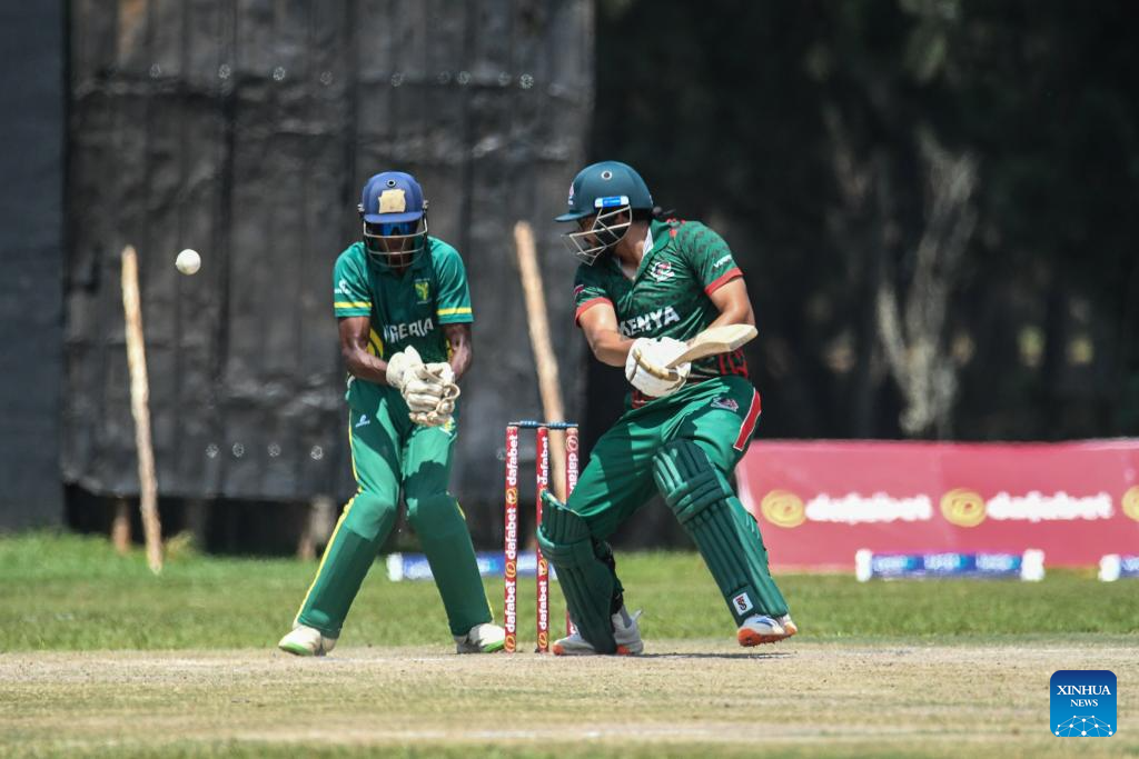 Sachin Gill (R) of Kenya hits the ball during the Pearl of Africa Cricket T20 Series match between Kenya and Nigeria in Entebbe, Uganda, July 27, 2025. (Photo by Hajarah Nalwadda/Xinhua)