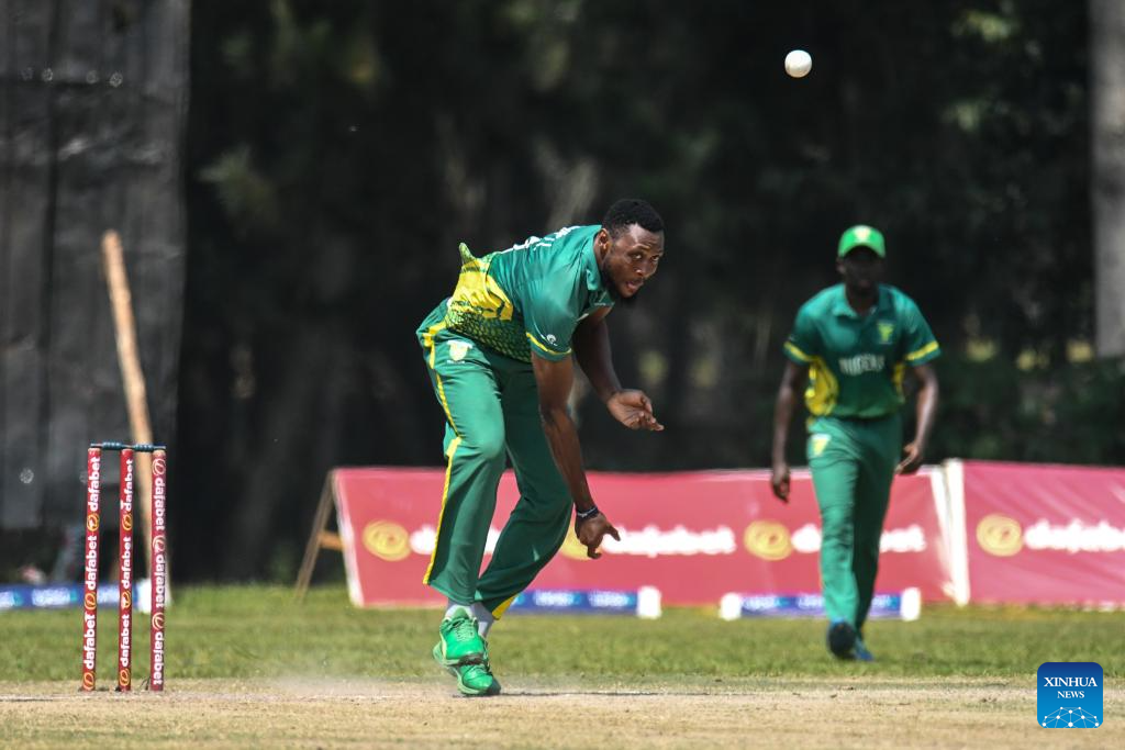 Isaac Okpe (L) of Nigeria bowls the ball during the Pearl of Africa Cricket T20 Series match between Kenya and Nigeria in Entebbe, Uganda, July 27, 2025. (Photo by Hajarah Nalwadda/Xinhua)