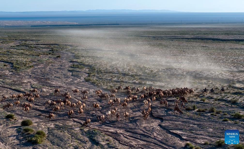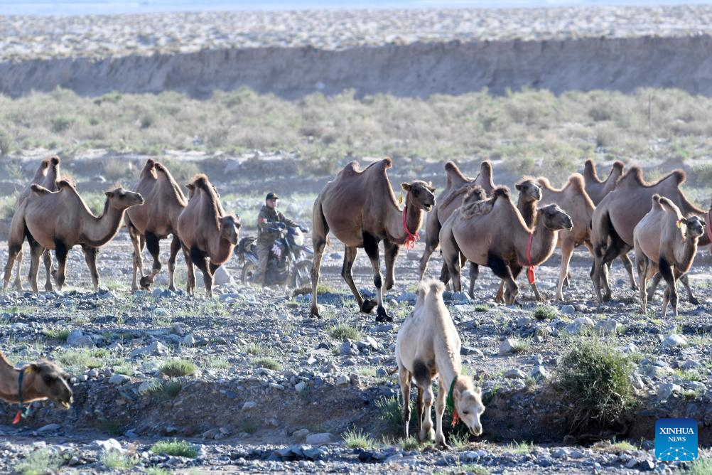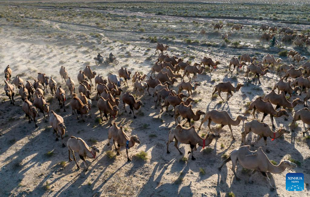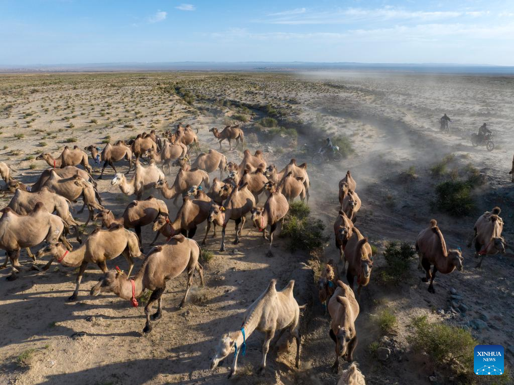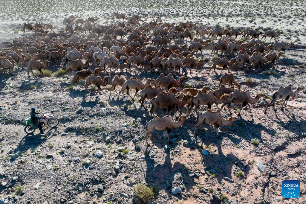 This photo taken on July 26, 2025 shows camels on their summer migration journey in the Kazak Autonomous County of Aksay, northwest China's Gansu Province. Herders in Jia'erwuzong Village of Aksay move their camels to the summer pastures of Qilian every summer, allowing the grasslands to rejuvenate and ensuring the sustainability of their animal husbandry. (Photo by Gao Hongshan/Xinhua)