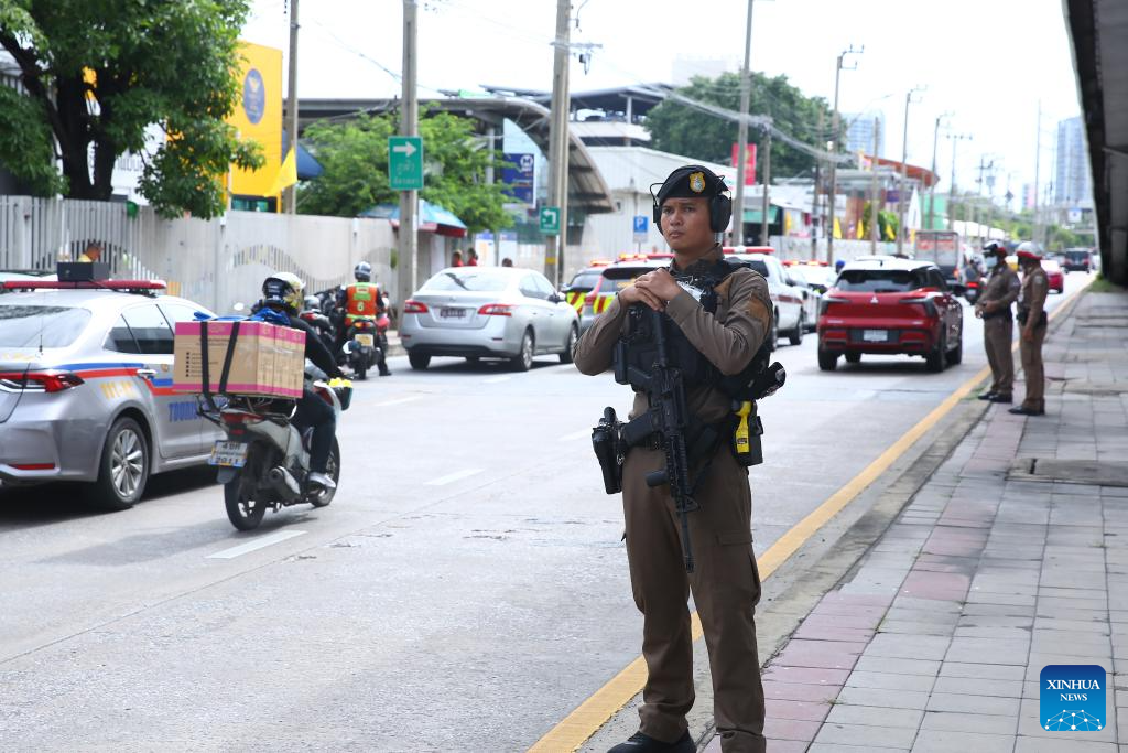 A security officer is on guard near the site of a shooting incident in Bangkok, Thailand, July 28, 2025. At least six people were killed in a shooting incident in Thailand's capital Bangkok on Monday, local media Thairath reported. The gunman opened fire in a market before killing himself, the report said. (Xinhua/Sun Weitong)