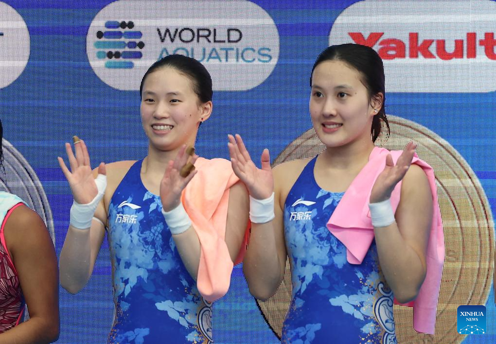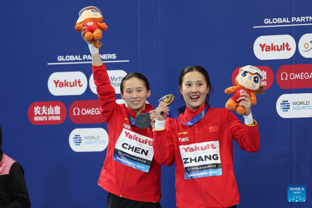 Chen Yuxi (L)/Zhang Minjie of China pose during the awarding ceremony for the women's 10m synchronised final of diving at the World Aquatics Championships in Singapore, July 28, 2025. (Xinhua/Luo Yuan)