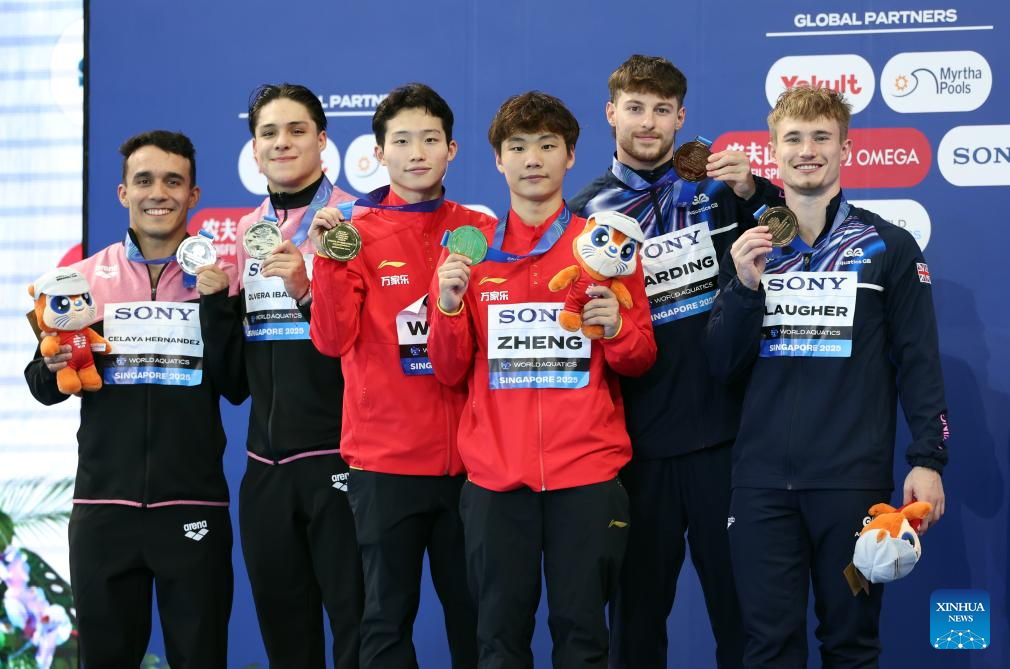 Gold medalists Wang Zongyuan (3rd L)/Zheng Jiuyuan (3rd R) of China, silver medalists Juan Manuel Celaya Hernandez (1st L)/Osmar Olvera Ibarra (2nd L) of Mexico and bronze medalists Jack Laugher (1st R)/Anthony Harding of Britain pose during the awarding ceremony for the men's 3m synchronised final of diving at the World Aquatics Championships in Singapore, July 28, 2025. (Xinhua/Luo Yuan)