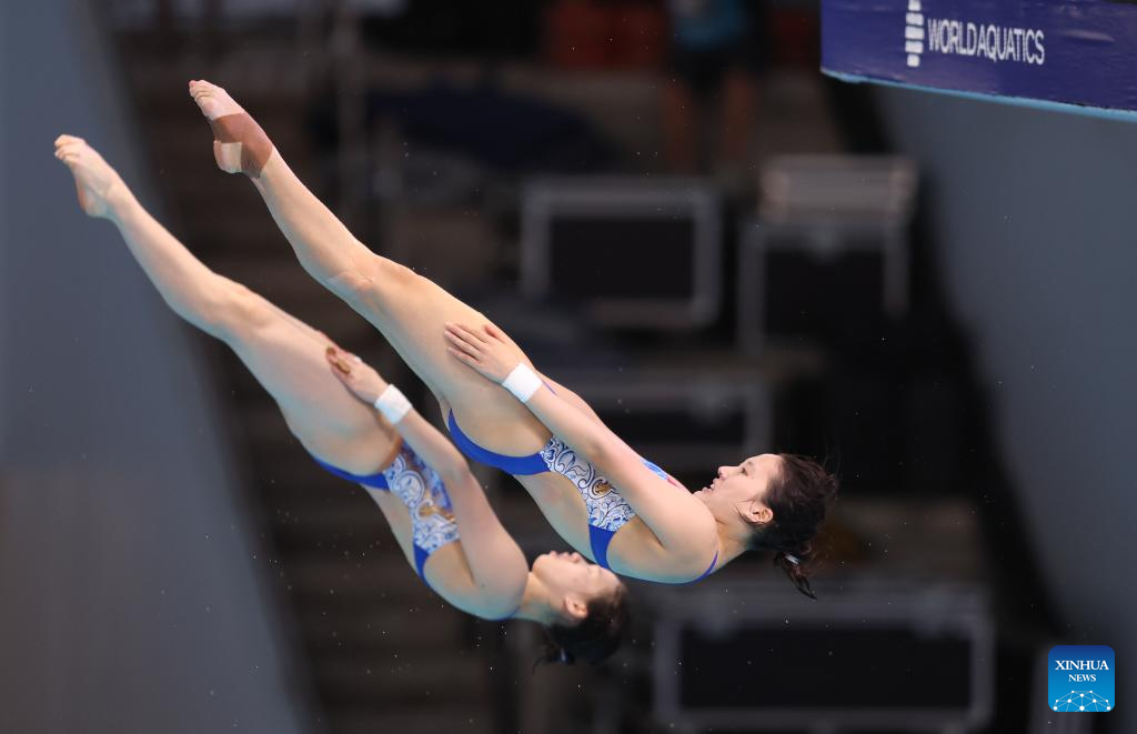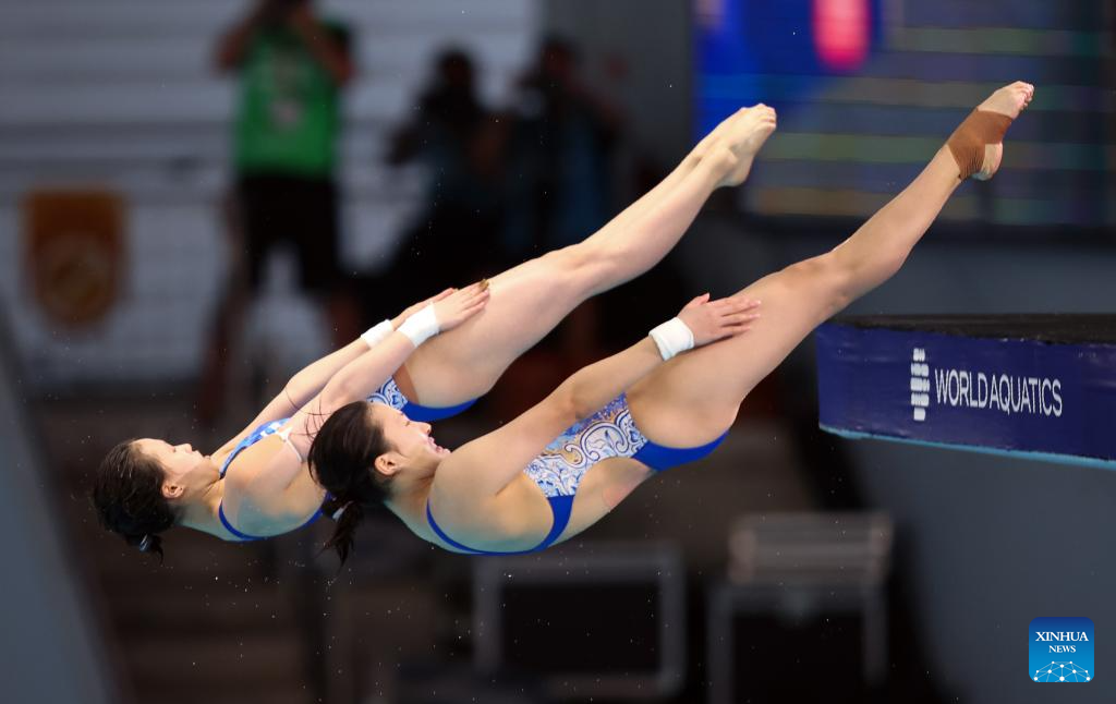 Chen Yuxi/Zhang Minjie of China compete during the women's 10m synchronised final of diving at the World Aquatics Championships in Singapore, July 28, 2025. (Xinhua/Luo Yuan)
