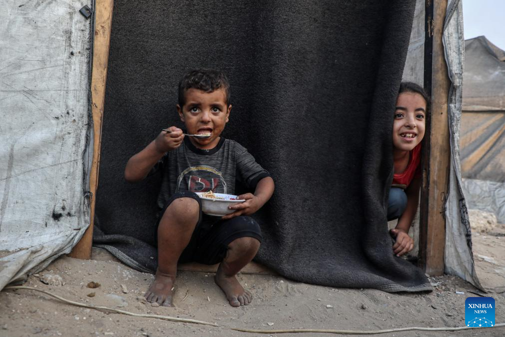 Displaced Palestinian children are seen at a shelter in the west of Gaza City on July 26, 2025. (Photo by Rizek Abdeljawad/Xinhua)