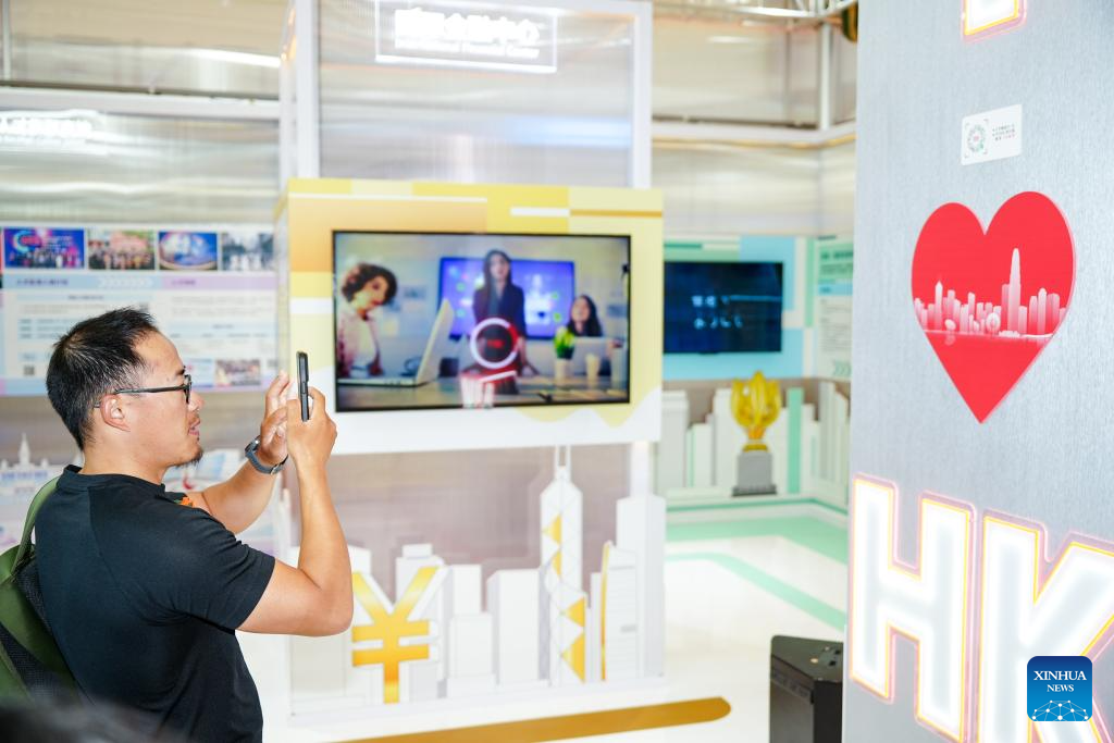 A visitor takes a photo at a Hong Kong-themed exhibition in Urumqi, northwest China's Xinjiang Uygur Autonomous Region, July 28, 2025. The exhibition kicked off here on Monday. (Xinhua/Xu Hongyan)