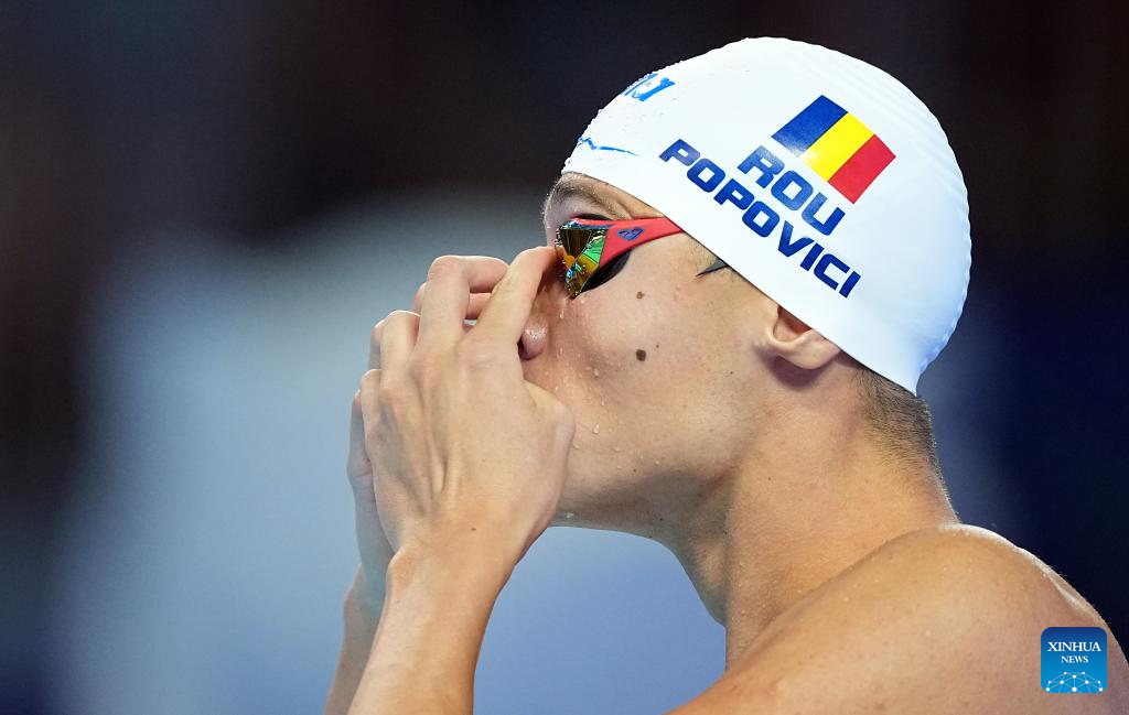 of Romania are seen after the men's 200m freestyle final of swimming at the World Aquatics Championships in Singapore, July 29, 2025. (Xinhua/Xue Yuge)