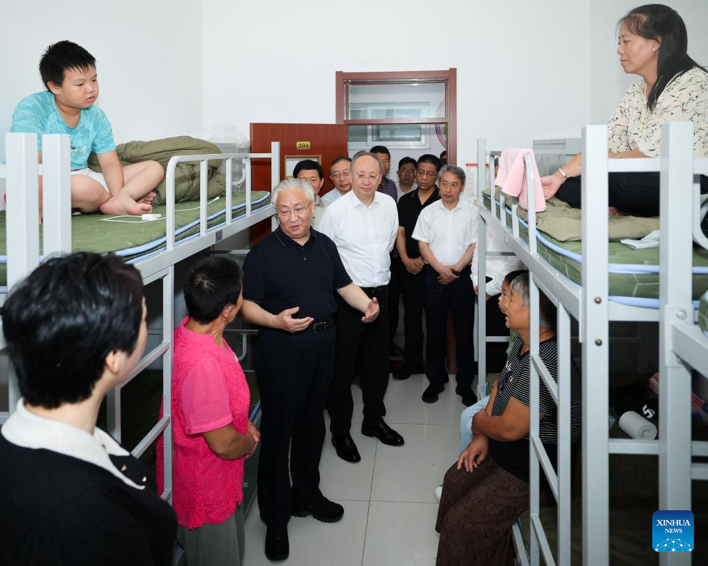 Chinese Vice Premier Zhang Guoqing, also a member of the Political Bureau of the Communist Party of China Central Committee, visits a temporary shelter in Miyun District of Beijing, capital of China, July 28, 2025. Entrusted with the task by Xi Jinping, general secretary of the Communist Party of China (CPC) Central Committee, Zhang arrived in Beijing's Miyun District on Monday evening to visit and console residents displaced by torrential rains, and to oversee on-site flood control and relief efforts. (Xinhua/Liu Bin)