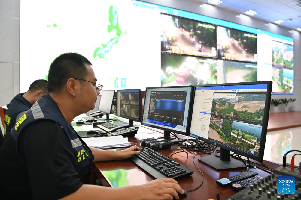 Staff members are on duty at an emergency headquarters in Jizhou District of north China's Tianjin, July 28, 2025. Houses, bridges and power lines at part of villages in Jizhou District were damaged by floods inflicted by recent heavy rainfall and upstream runoff.