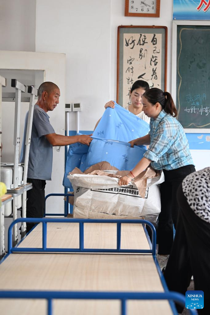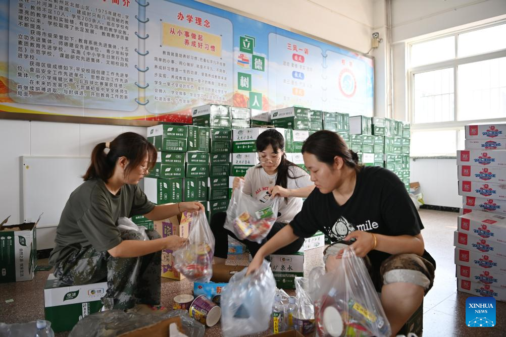 Staff members prepare food and water at a school-turned relocation site in Xiaying Town, Jizhou District of north China's Tianjin, July 28, 2025. Houses, bridges and power lines at part of villages in Jizhou District were damaged by floods inflicted by recent heavy rainfall and upstream runoff.