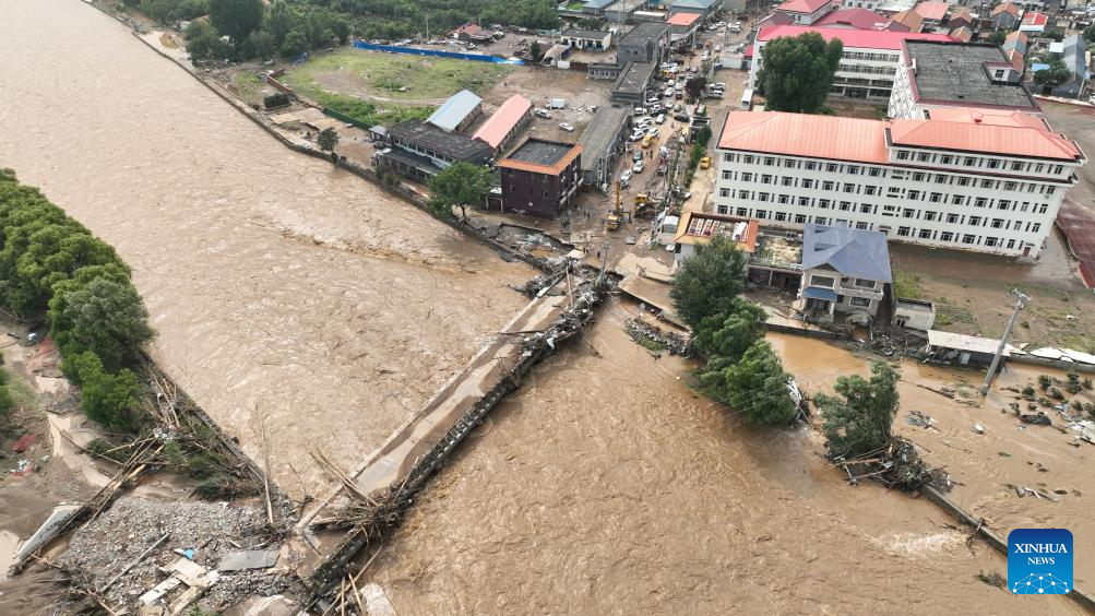 An aerial drone photo taken on July 28, 2025 shows a road and a bridge affected by flood at Xiaying Village of Xiaying Town, Jizhou District of north China's Tianjin. Houses, bridges and power lines at part of villages in Jizhou District were damaged by floods inflicted by recent heavy rainfall and upstream runoff.