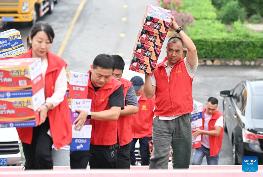 Volunteers deliver disaster relief supplies at a school-turned relocation site in Xiaying Town, Jizhou District of north China's Tianjin, July 28, 2025. Houses, bridges and power lines at part of villages in Jizhou District were damaged by floods inflicted by recent heavy rainfall and upstream runoff.