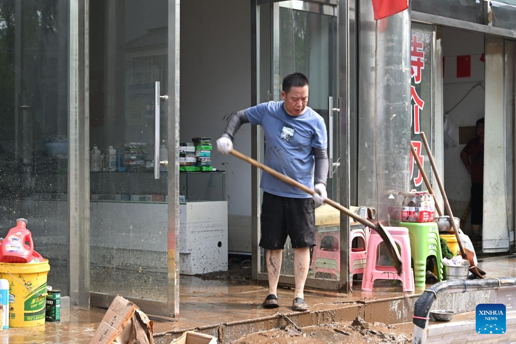 A resident clears silt at Xiaying Village of Xiaying Town, Jizhou District of north China's Tianjin, July 28, 2025. Houses, bridges and power lines at part of villages in Jizhou District were damaged by floods inflicted by recent heavy rainfall and upstream runoff.
