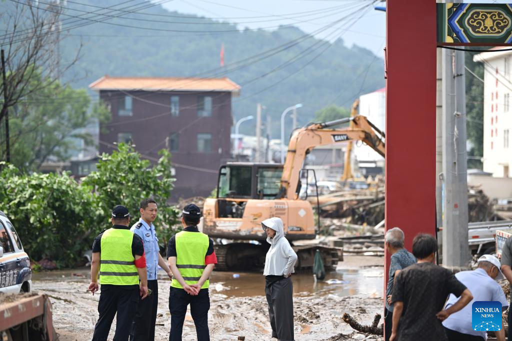 Emergency workers are on duty at Xiaying Village of Xiaying Town, Jizhou District of north China's Tianjin, July 28, 2025. Houses, bridges and power lines at part of villages in Jizhou District were damaged by floods inflicted by recent heavy rainfall and upstream runoff.