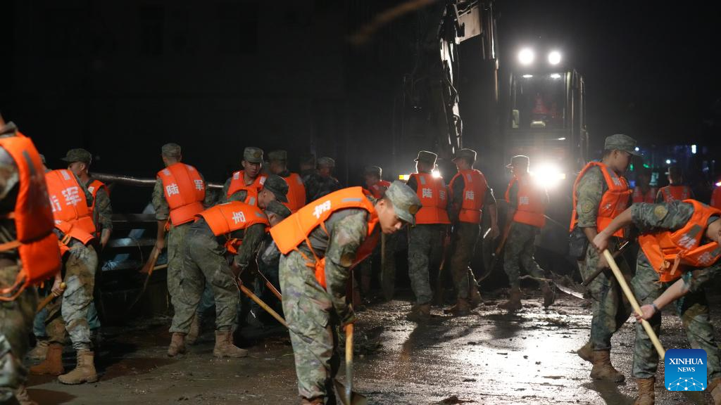 Members of the Chinese People's Liberation Army conduct disaster relief work at night in Jizhou District of north China's Tianjin, July 28, 2025. The Chinese People's Liberation Army, the People's Armed Police Force and local militias have deployed troops to join disaster relief efforts in China's flood-stricken areas.