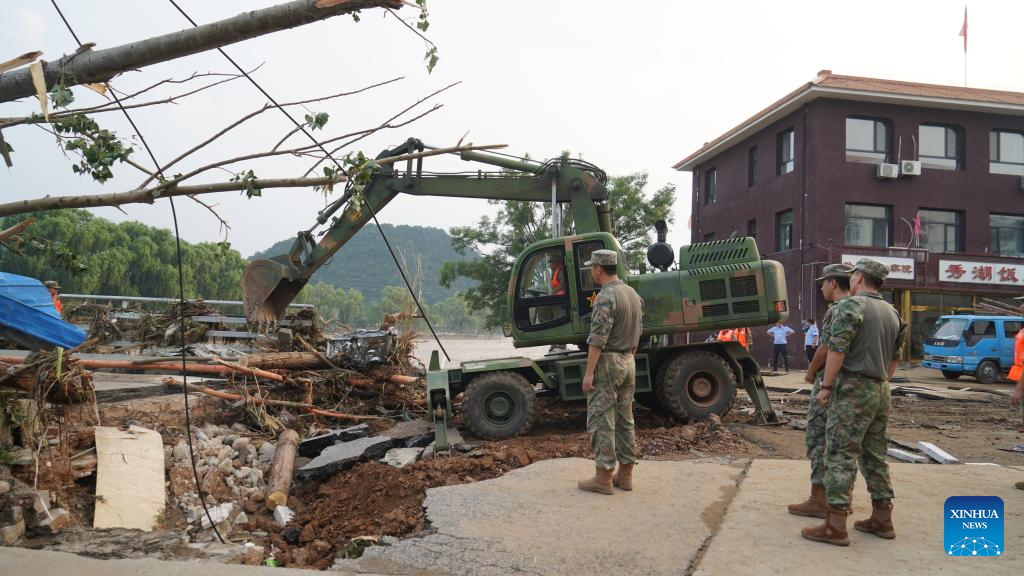 Members of the Chinese People's Liberation Army repair a damaged road in Jizhou District of north China's Tianjin, July 28, 2025. The Chinese People's Liberation Army, the People's Armed Police Force and local militias have deployed troops to join disaster relief efforts in China's flood-stricken areas.
