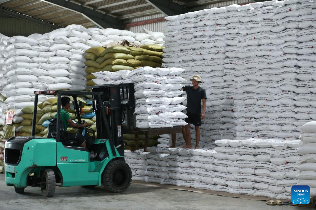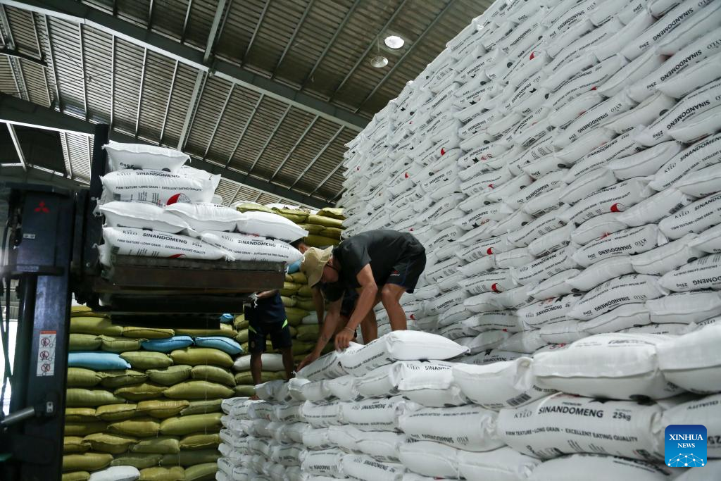 Workers transfer packages of rice at a warehouse in Yangon, Myanmar, July 28, 2025. (Xinhua/Myo Kyaw Soe)