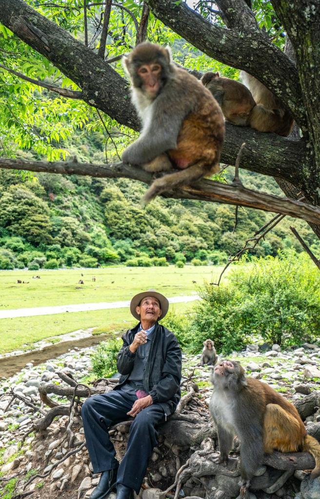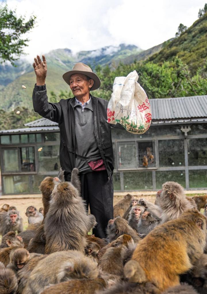 His kindness to the macaques touched the villagers of Linze Village, who cleaned up the areas where the Tibetan macaques often show up, so as to prevent them from mistakenly eating garbage. Thus, the Tibetan macaque families thrive, with more than 7,000 of them inhabiting here.