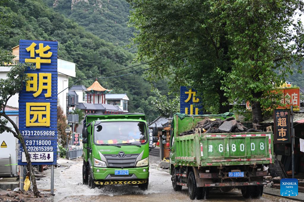 This photo taken on July 29, 2025 shows dump trucks in Changzhou Village of Xiaying Town in Jizhou District, north China's Tianjin. Heavy rainfall has affected Jizhou District for days and triggered mountain floods. Relief and restoration efforts are underway to resume normal production and life order as early as possible. (Xinhua/Li Ran)