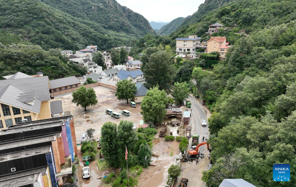 An aerial drone photo taken on July 29, 2025 shows engineering vehicles taking part in the repair of a road in Changzhou Village of Xiaying Town in Jizhou District, north China's Tianjin. Heavy rainfall has affected Jizhou District for days and triggered mountain floods. Relief and restoration efforts are underway to resume normal production and life order as early as possible. (Xinhua/Li Ran)