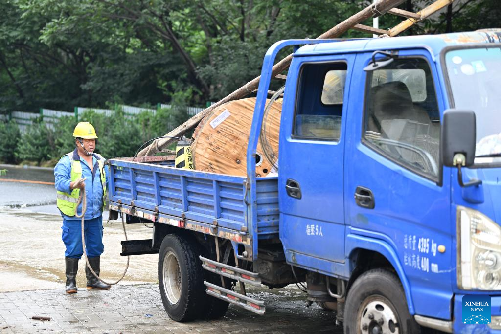 A worker prepares to repair optic cable in Changzhou Village of Xiaying Town in Jizhou District, north China's Tianjin, July 29, 2025. Heavy rainfall has affected Jizhou District for days and triggered mountain floods. Relief and restoration efforts are underway to resume normal production and life order as early as possible. (Xinhua/Li Ran)