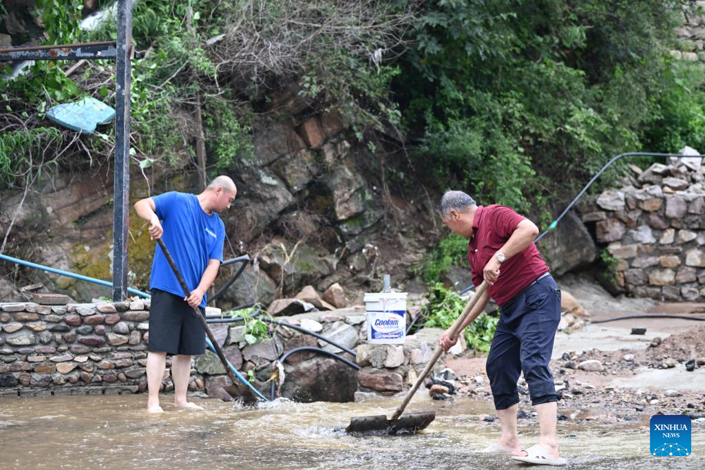 Villagers drain water in Changzhou Village of Xiaying Town in Jizhou District, north China's Tianjin, July 29, 2025. Heavy rainfall has affected Jizhou District for days and triggered mountain floods. Relief and restoration efforts are underway to resume normal production and life order as early as possible. (Xinhua/Li Ran)