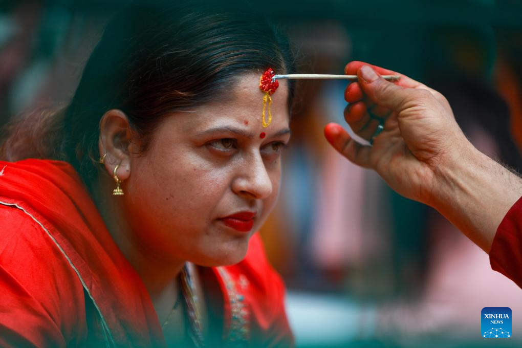 A devotee receives a tika on her forehead during the celebration of Naga Panchami, a Hindu festival dedicated to the worship of snakes, in Kathmandu, Nepal, July 29, 2025. (Photo by Sulav Shrestha/Xinhua)