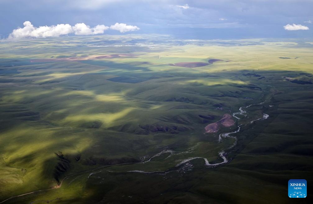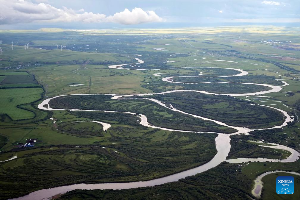 This aerial photo taken with a mobile phone shows a river running through a grassland in Hulun Buir, north China's Inner Mongolia Autonomous Region, July 29, 2025. (Xinhua/Jia Lijun)