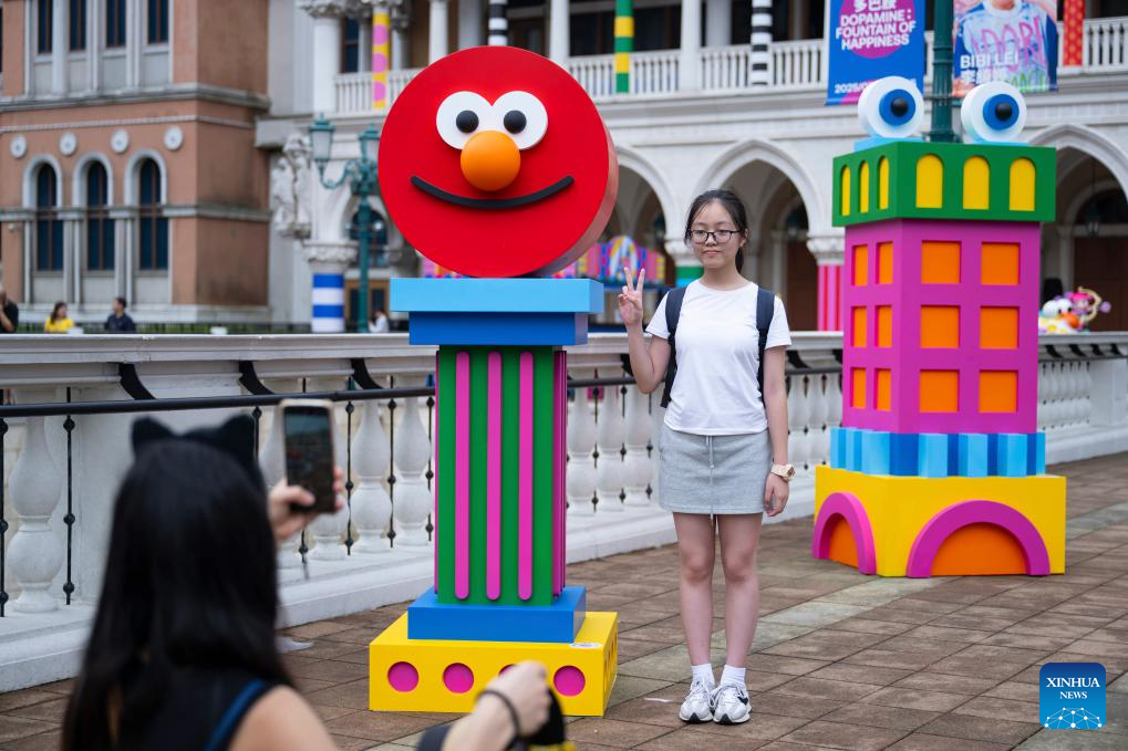 A tourist poses for a photo with an artwork on display during the special exhibition "Dopamine: Fountain of Happiness" at the Venetian Macao in Macao, south China, July 29, 2025. As a special exhibition of Art Macao: Macao International Art Biennale 2025, the event kicked off here on Tuesday. (Xinhua/Cheong Kam Ka)