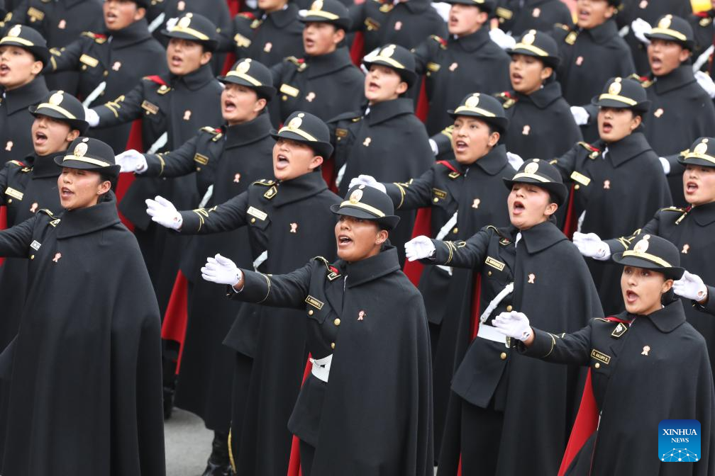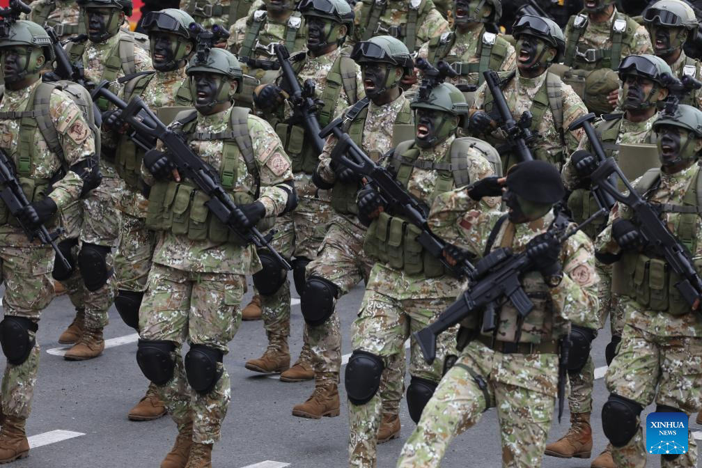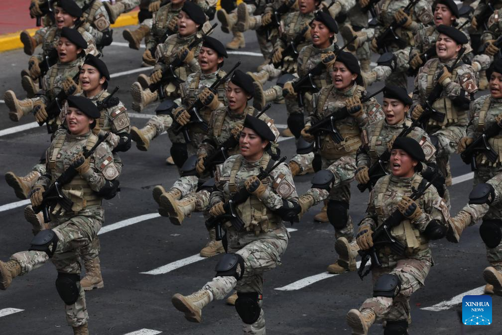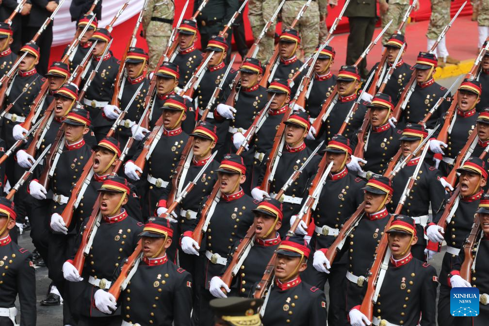 Soldiers participate in a parade to commemorate the 204th anniversary of Peru's independence in Lima, Peru, on July 29, 2025. (Photo by Mariana Bazo/Xinhua)