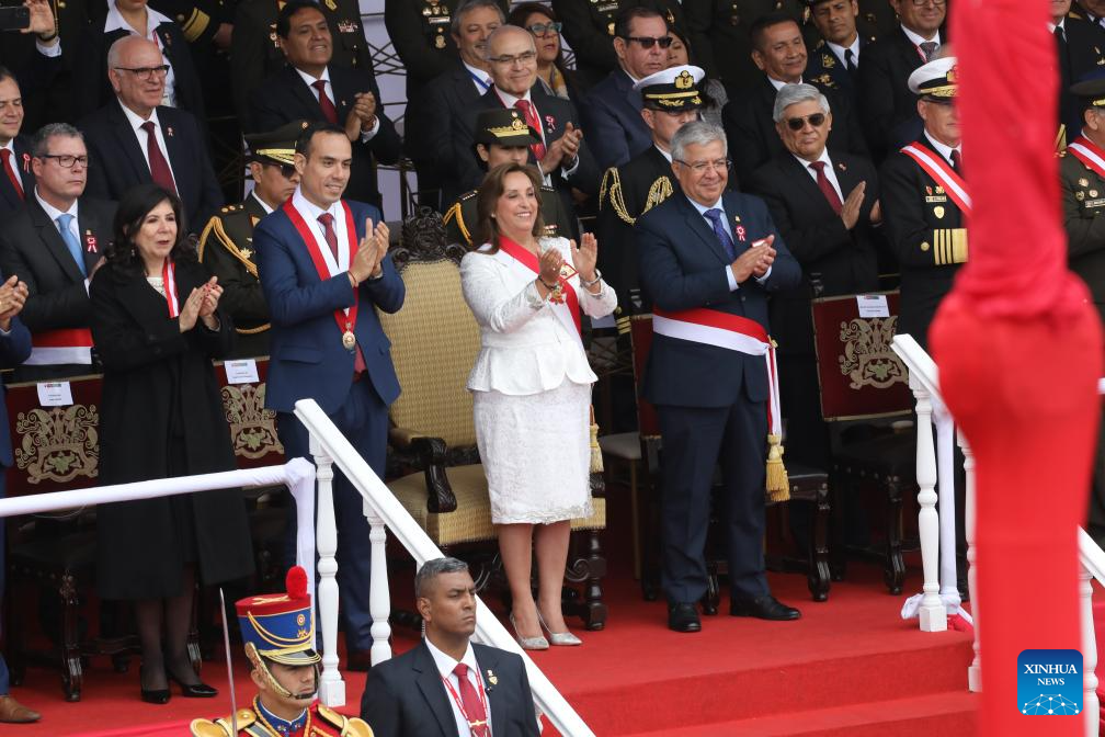 Peru's President Dina Boluarte (C) attends a parade to commemorate the 204th anniversary of Peru's independence in Lima, Peru, on July 29, 2025. (Photo by Mariana Bazo/Xinhua)