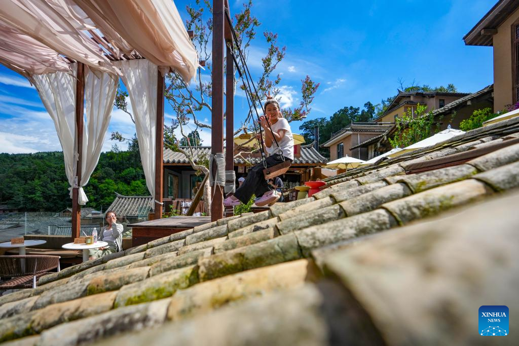 Tourists are pictured at a cafe in Leju Village in Xishan District of Kunming City, southwest China's Yunnan Province, July 27, 2025. Leju Village in Kunming is an ancient Yi ethnic village with a history of over 600 years. Its name, derived from the Yi language, means "the village at the foot of the rocky mountain," and it is renowned for its unique residential architecture.(Xinhua/Chen Xinbo)