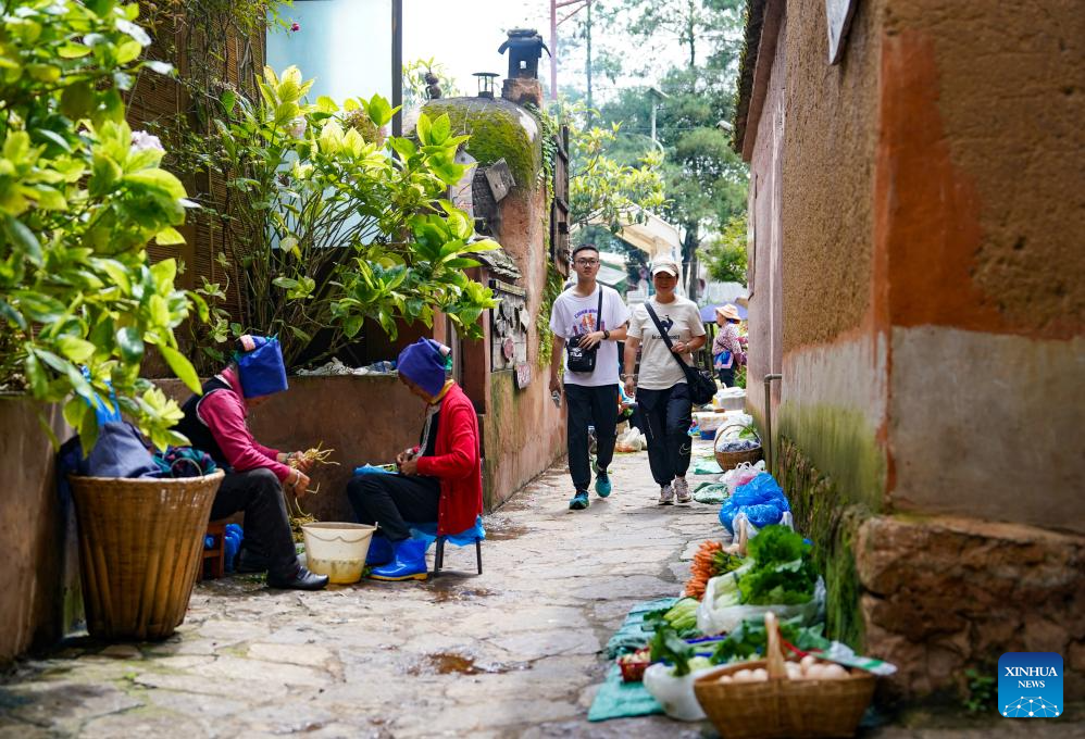 Tourists visit a wet market in Leju Village in Xishan District of Kunming City, southwest China's Yunnan Province, July 27, 2025. Leju Village in Kunming is an ancient Yi ethnic village with a history of over 600 years. Its name, derived from the Yi language, means "the village at the foot of the rocky mountain," and it is renowned for its unique residential architecture.(Xinhua/Chen Xinbo)