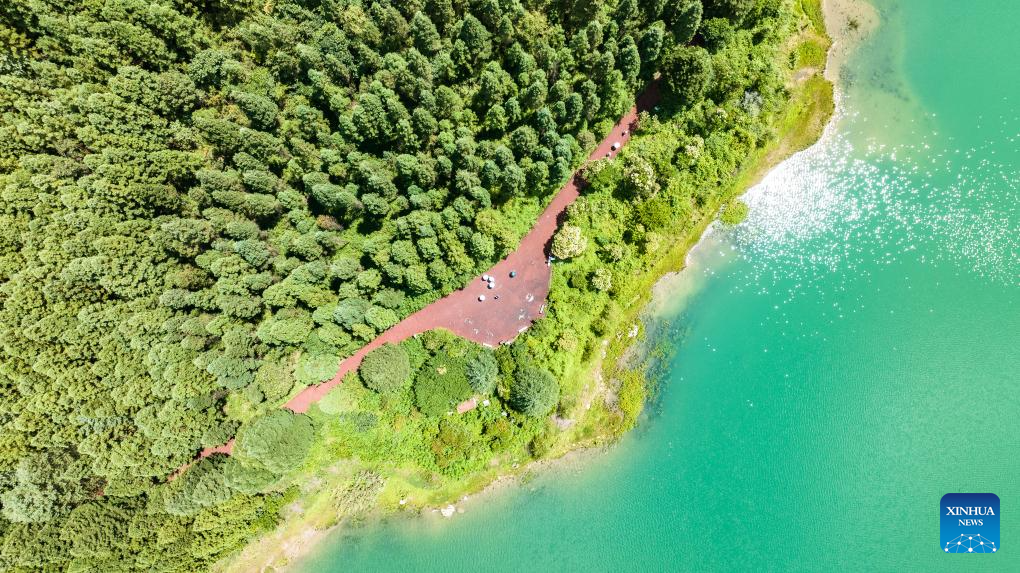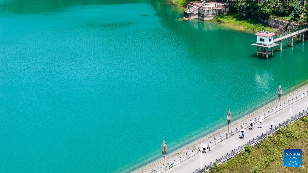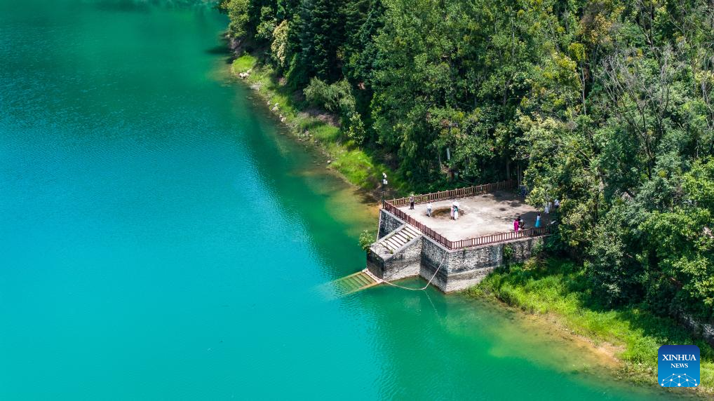 An aerial drone photo taken on July 30, 2025 shows tourists sightseeing at Yaochi Park in Zhongshan District of Liupanshui, southwest China's Guizhou Province. (Xinhua/Tao Liang)