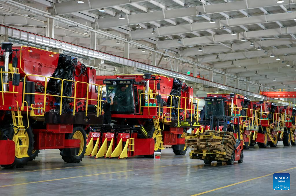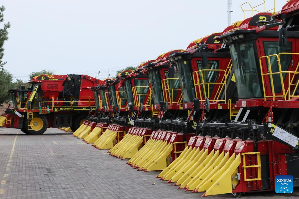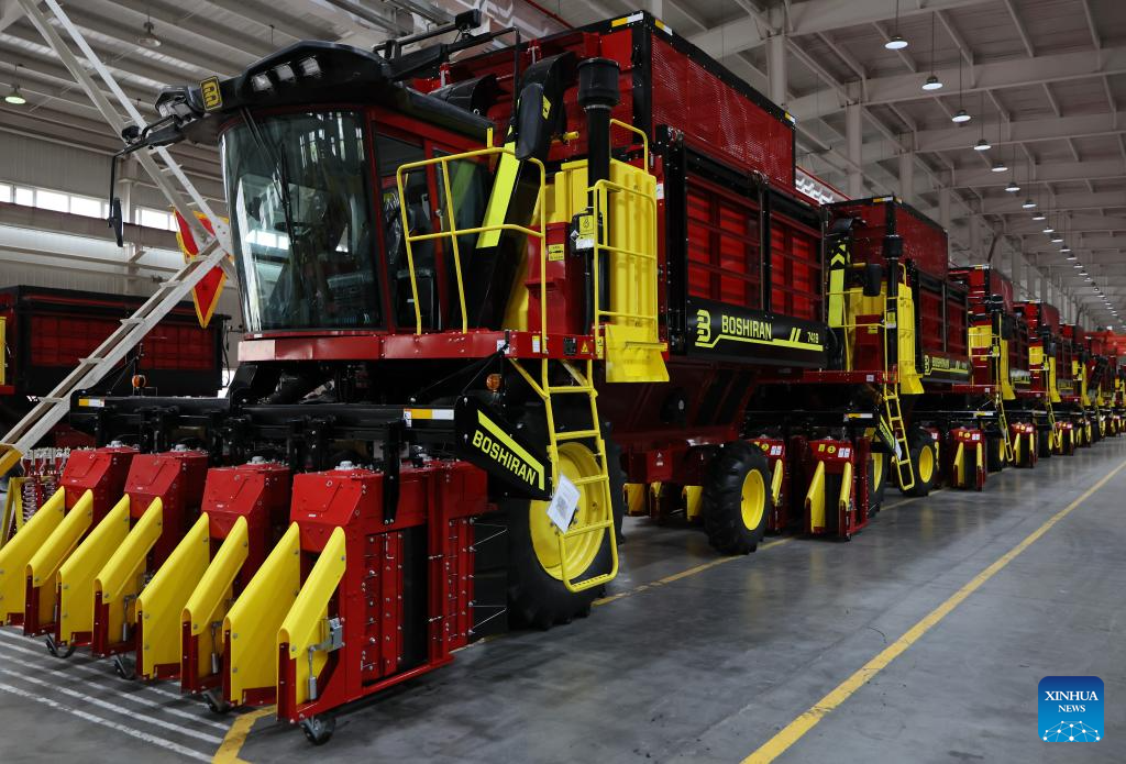 This photo taken on July 28, 2025 shows cotton harvesters at Xinjiang Boshiran Intelligent Agricultural Machinery Co., Ltd. in Wusu City, northwest China's Xinjiang Uygur Autonomous Region. Founded in Xinjiang's Wusu City in 2009, Boshiran has developed more than 30 models of agricultural machinery including cotton planters, sprayers, and harvesters, which cover the entire cycle of cotton farming.