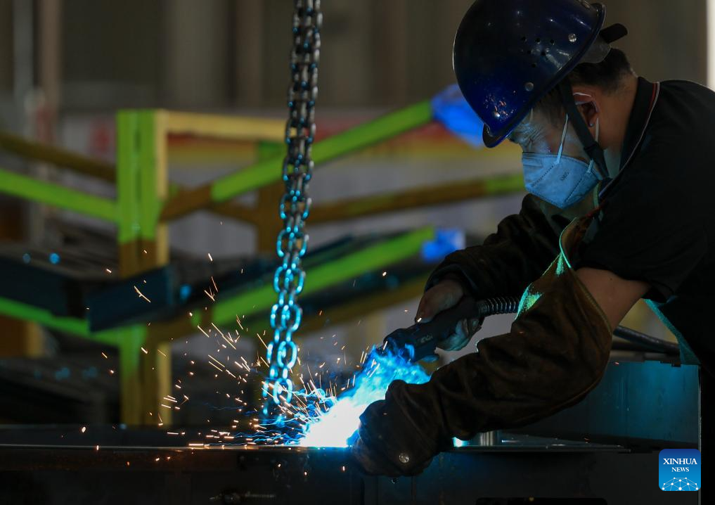 A worker welds components at the cotton harvester manufacturing workshop of Xinjiang Boshiran Intelligent Agricultural Machinery Co., Ltd. in Wusu City, northwest China's Xinjiang Uygur Autonomous Region, July 29, 2025. Founded in Xinjiang's Wusu City in 2009, Boshiran has developed more than 30 models of agricultural machinery including cotton planters, sprayers, and harvesters, which cover the entire cycle of cotton farming.